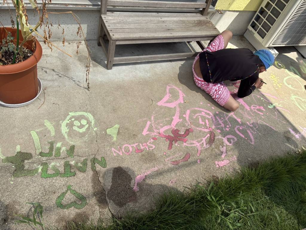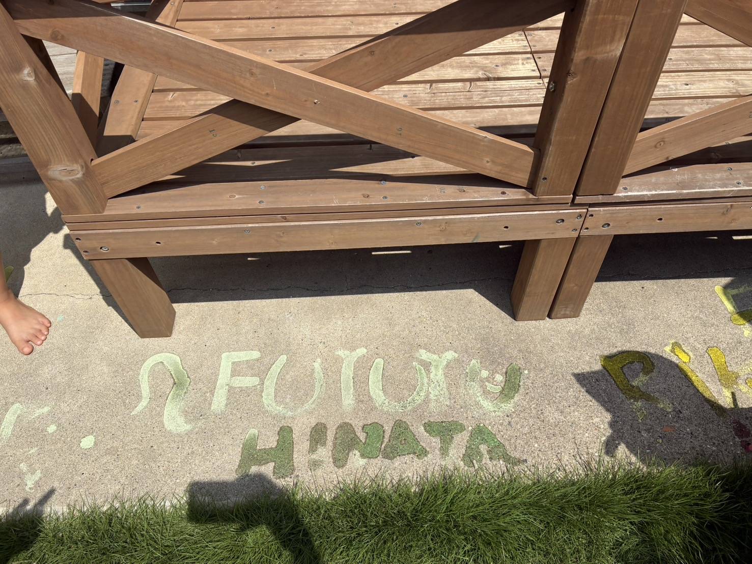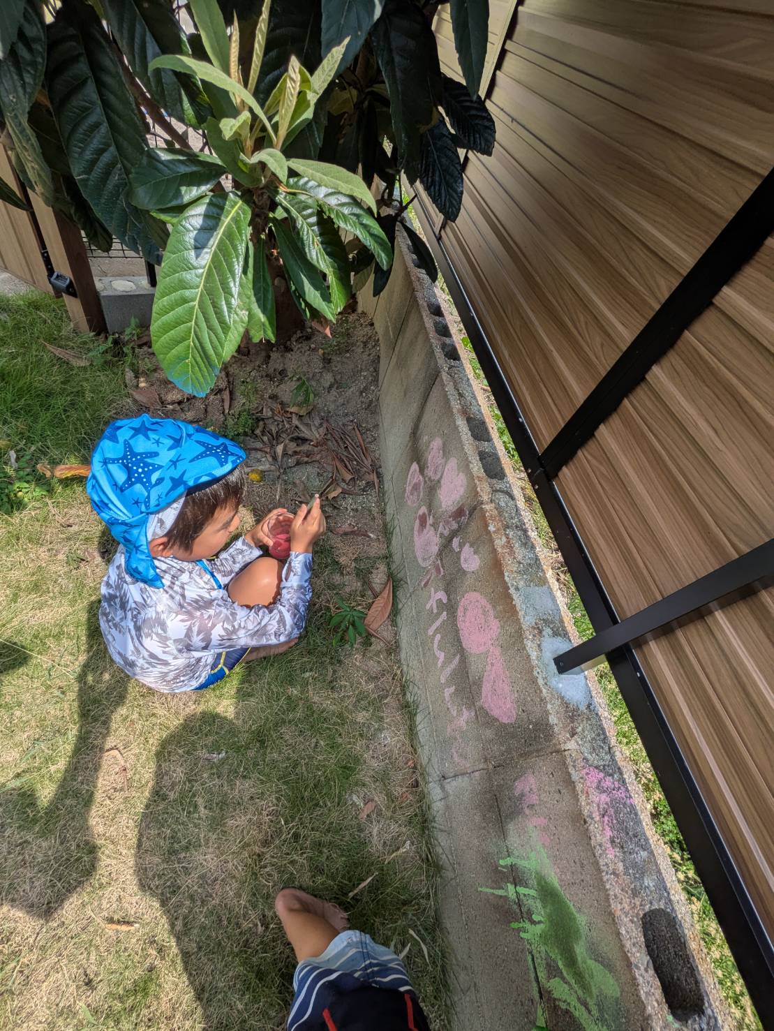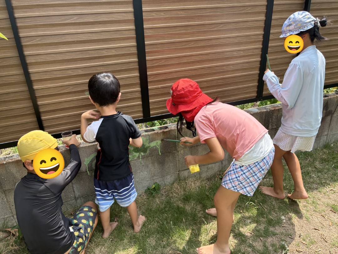 庭では壁やコンクリートの地面に魔法の液でお絵かきタイム。