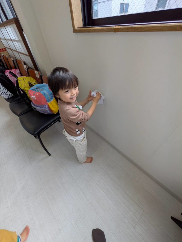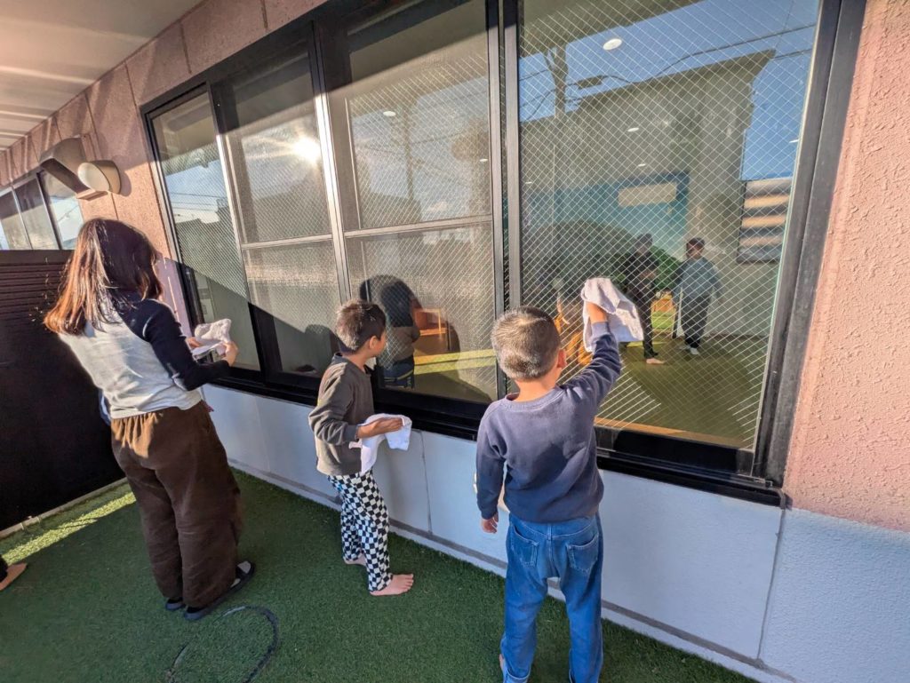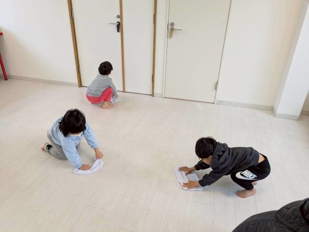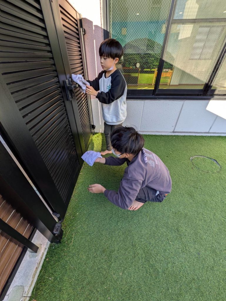 一年間過ごしたお部屋に感謝の想いをこめて、子どもたちと大掃除をしました。1、2.、3!と友だちと声を掛け合いながら楽しそうに窓ふきをしたり、床の雑巾がけをしている姿。