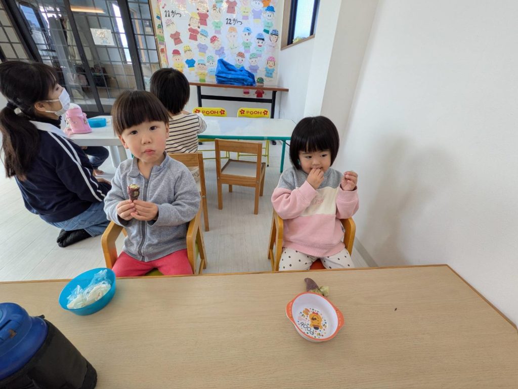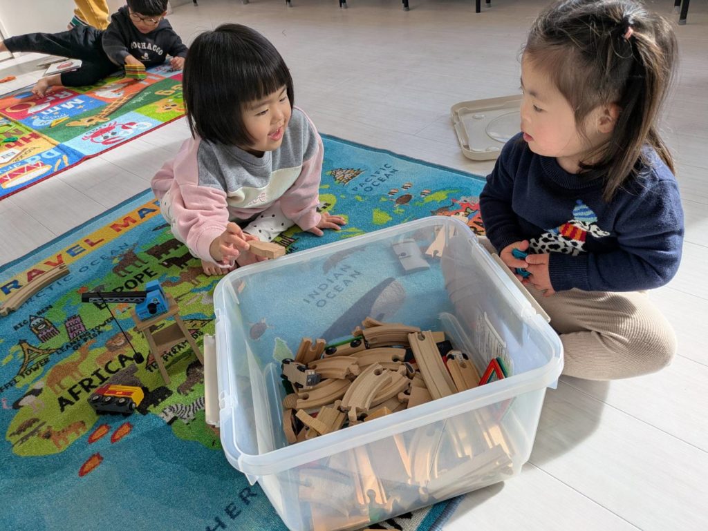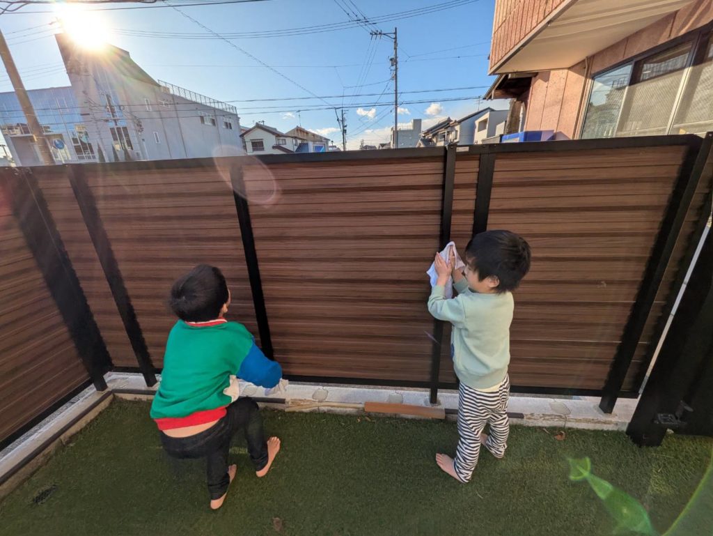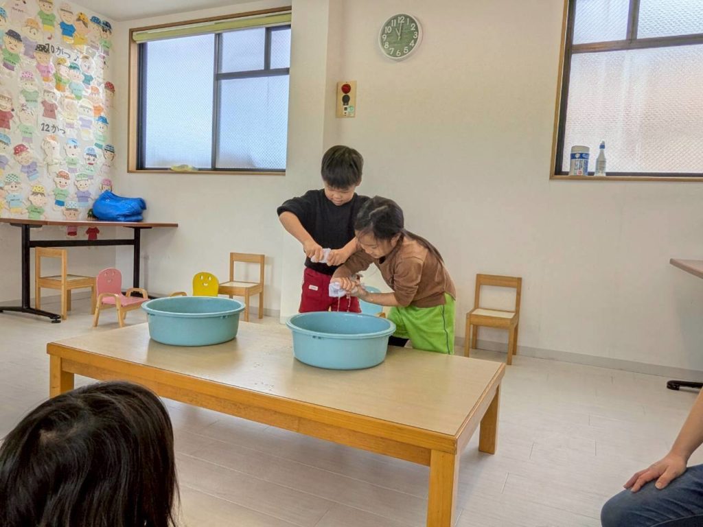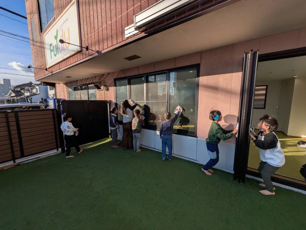 一年間過ごしたお部屋に感謝の想いをこめて、子どもたちと大掃除をしました。1、2.、3!と友だちと声を掛け合いながら楽しそうに窓ふきをしたり、床の雑巾がけをしている姿。