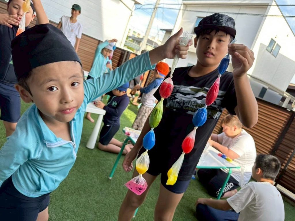 その日は、自分で絵の具を溶かした色水を傘袋に入れて色水カーテンを作るという活動でした!