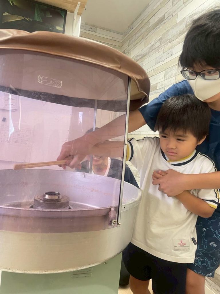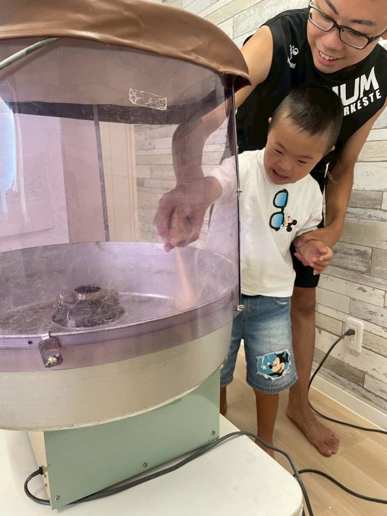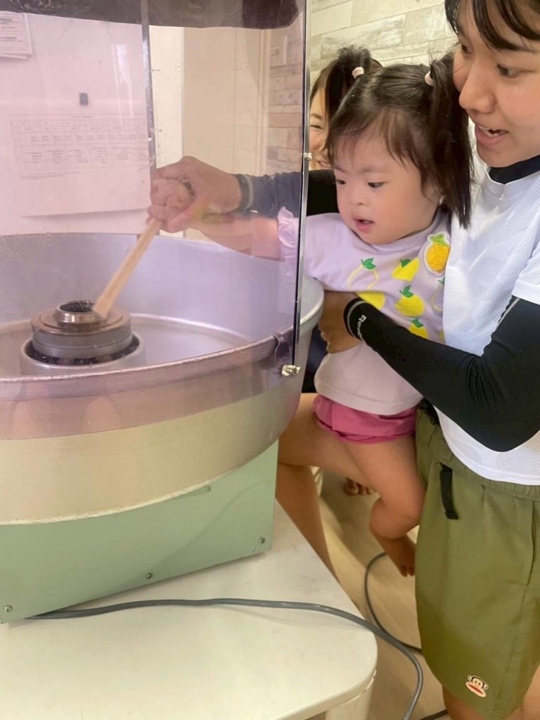 綿菓子を手に持って、口に当てたり、お友だちの作ってる姿は楽しそうに見れていました。