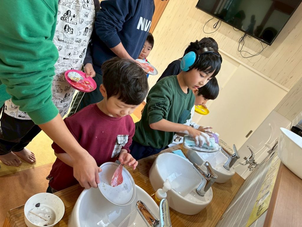 食べた後は食器も自分達で洗います。